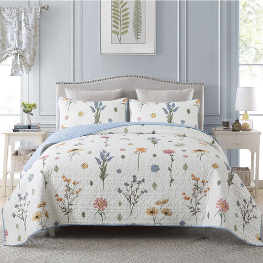 Blue & Yellow Floral 3 Piece Bedding Quilt Set