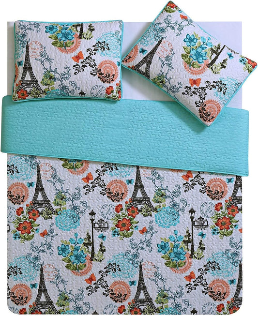 Hurry! Limited Stock!Eiffel Tower Aqua Blue Reversible 3 Piece Bedding Quilt Set