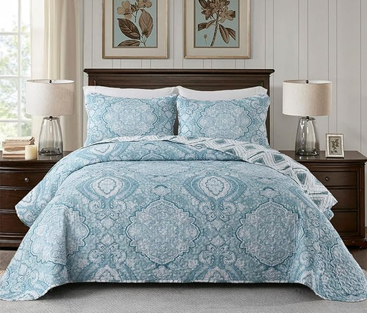 Hurry! Limited Stock!Boho Blue Floral Reversible 3 Piece Bedding Quilt Set