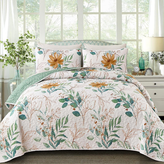 Hurry! Limited Stock!Botanical Sage Green & Golden Leaves Reversible 3 Piece Quilt Set