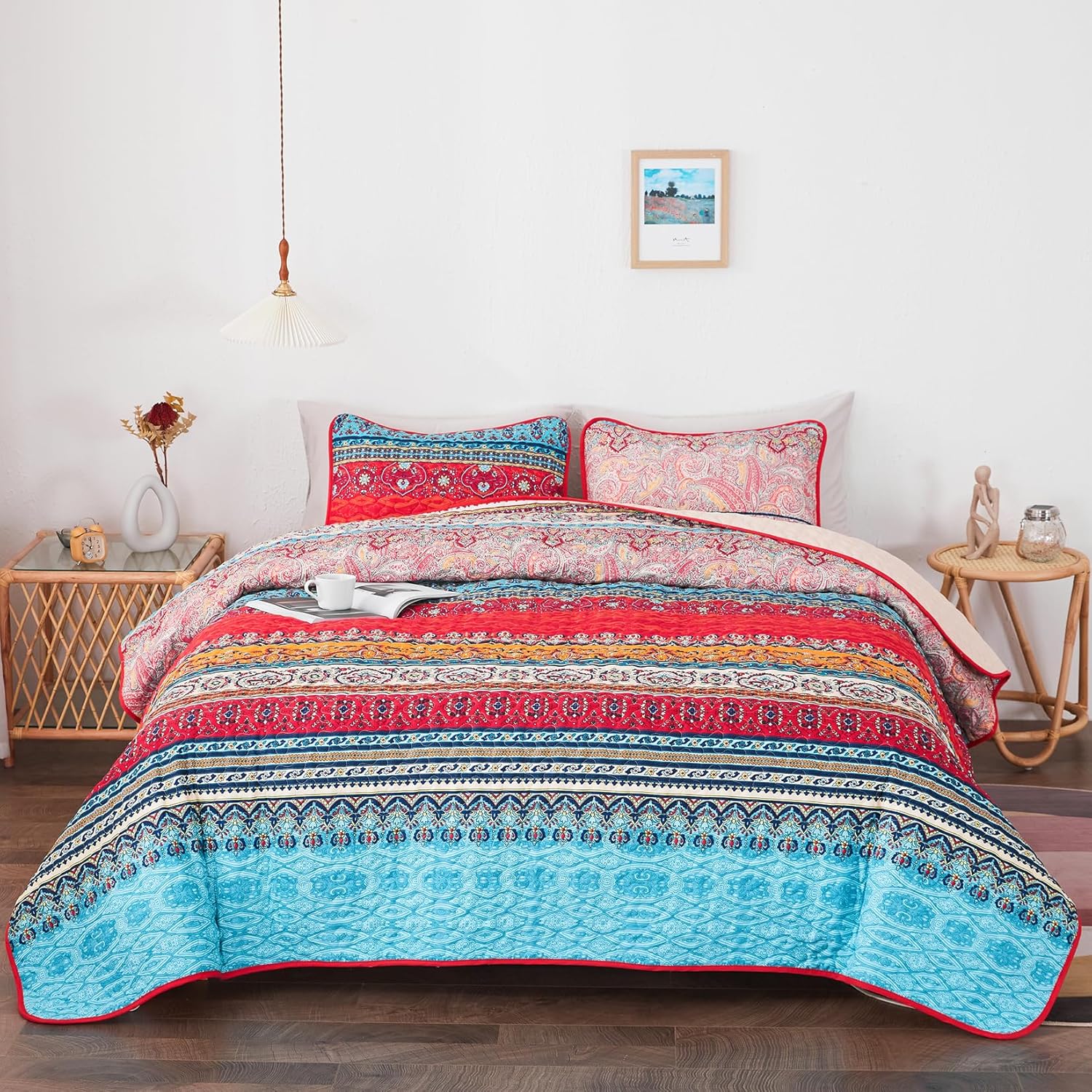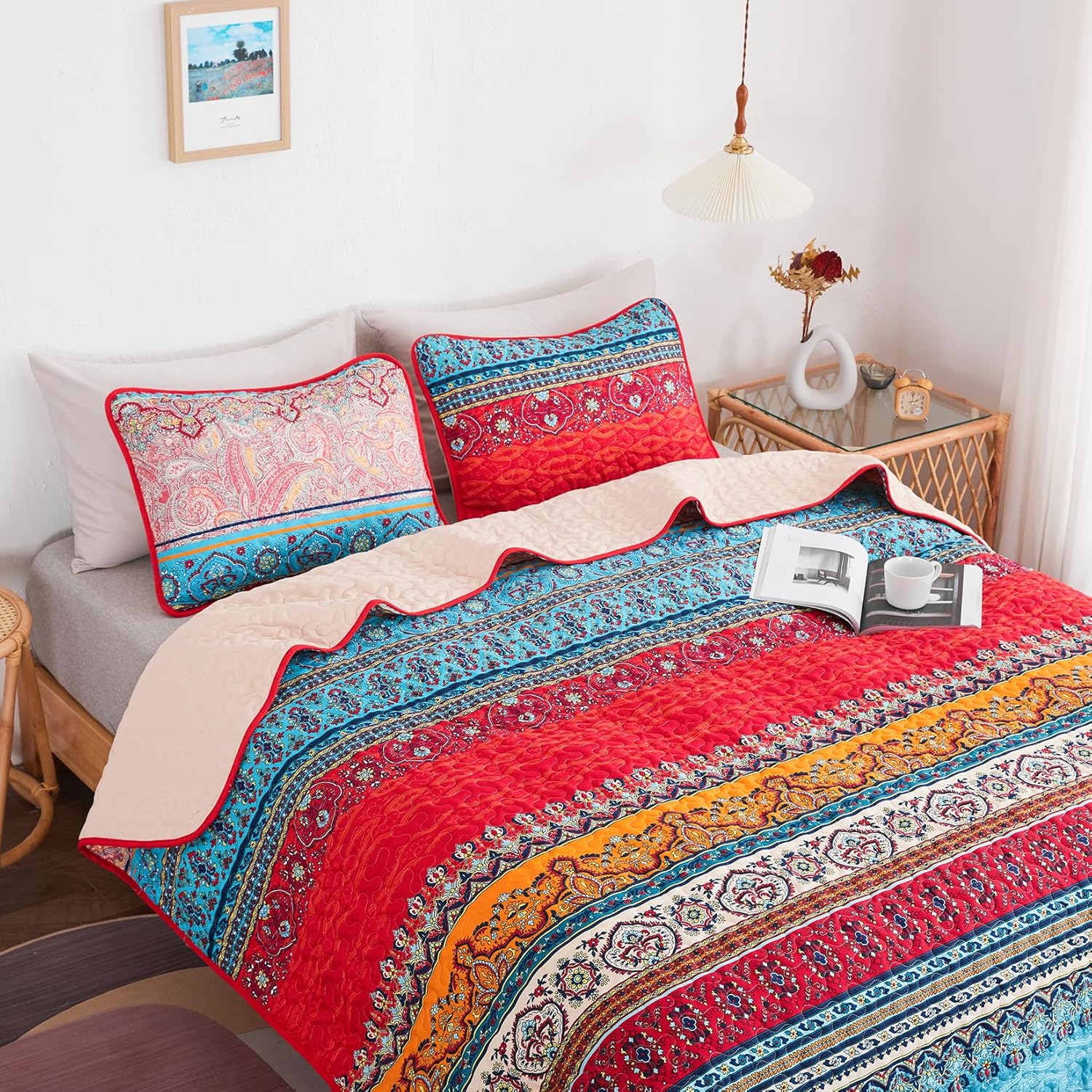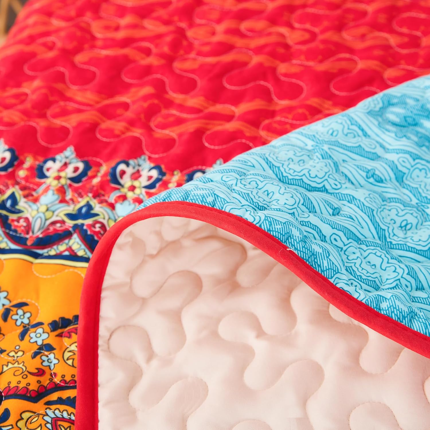 Ensemble de courtepointe réversible 3 pièces bohème orange et bleu