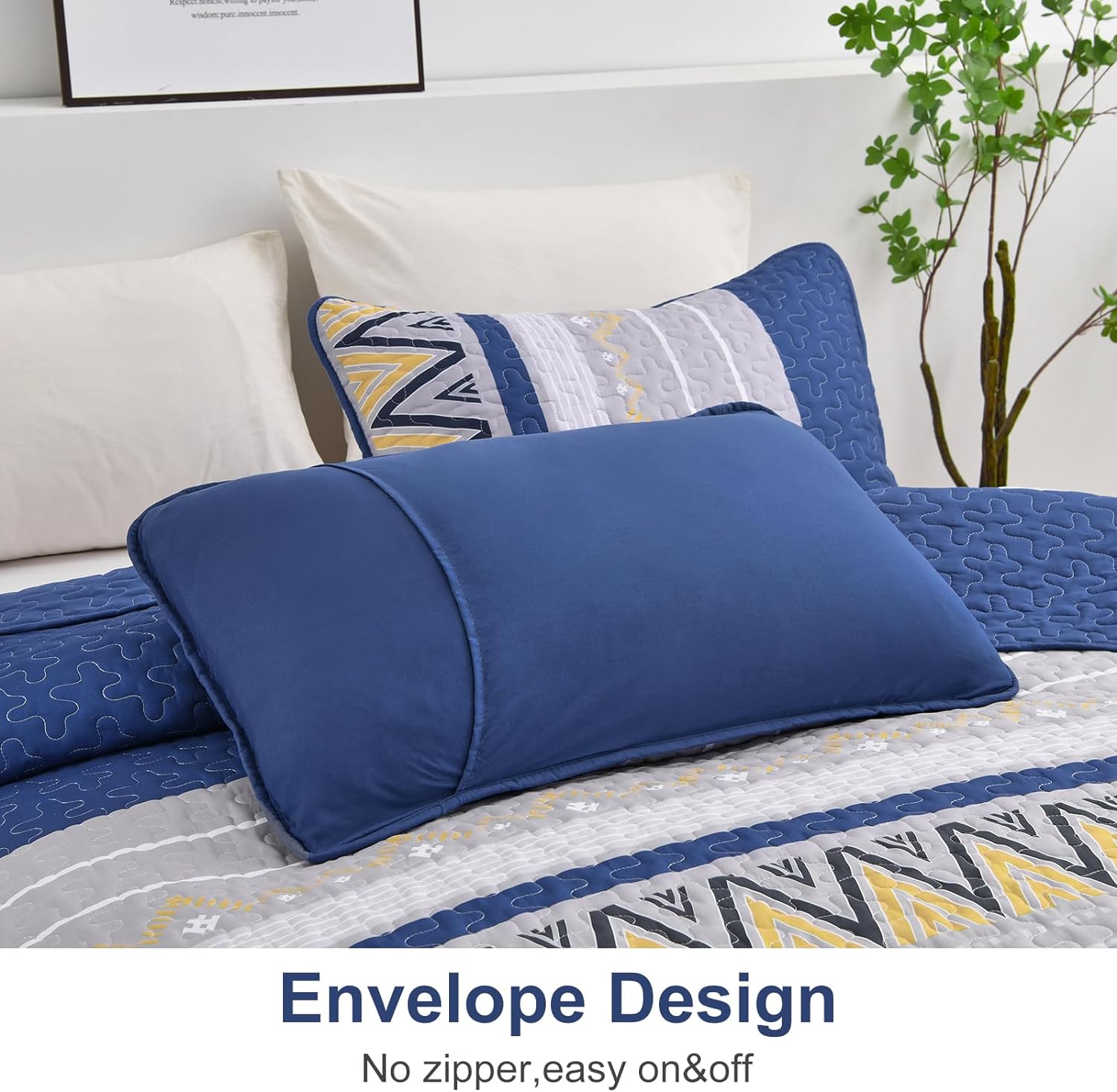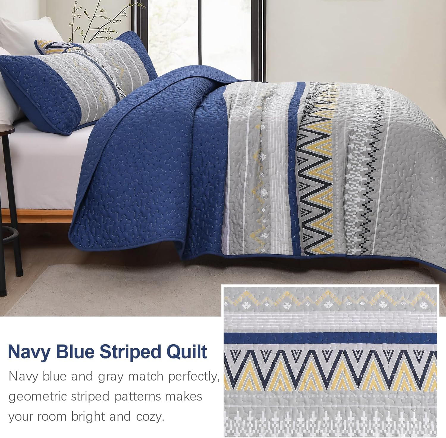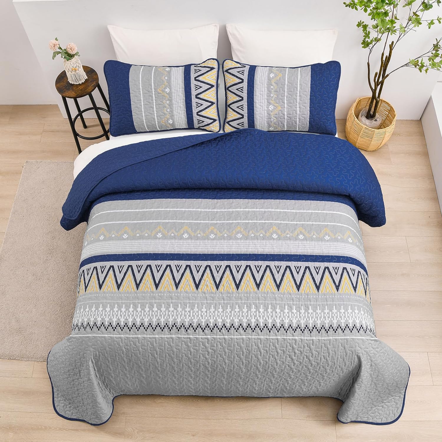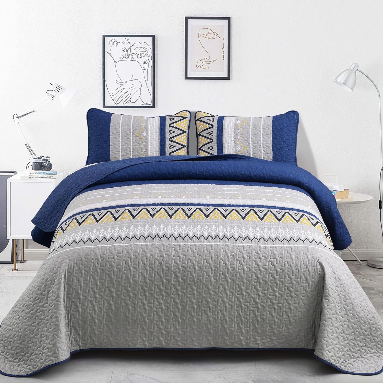 Ensemble de courtepointe réversible 3 pièces Boho gris et bleu marine