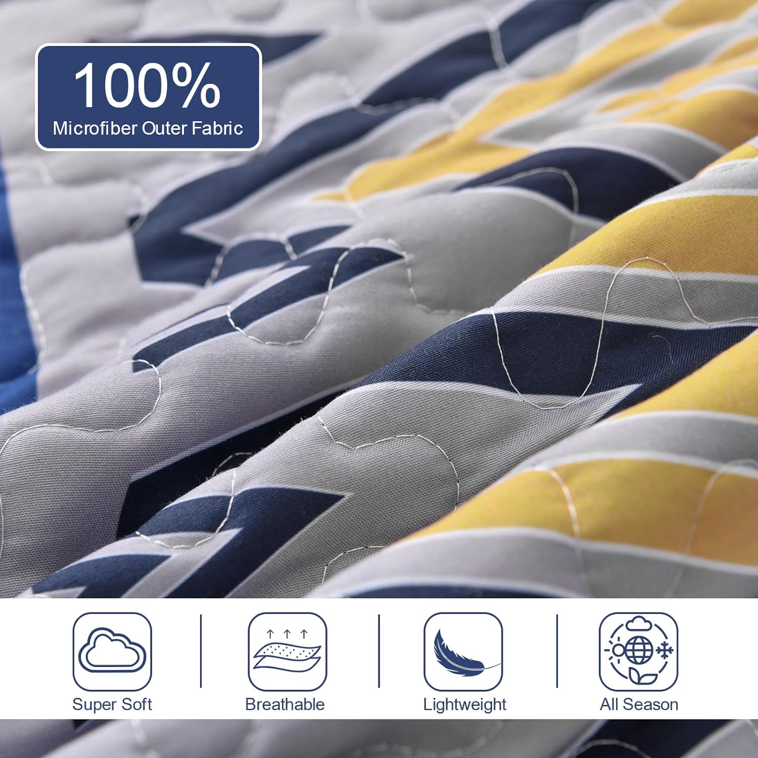 Des chevrons géométriques bleu marine et jaune, des triangles et des motifs patchwork rayés sur une couette grise redonnent à votre chambre une façade élégante et moderne. Le mélange parfait de couleurs vives et éclatantes, illuminez votre maison avec un look bohème chic.