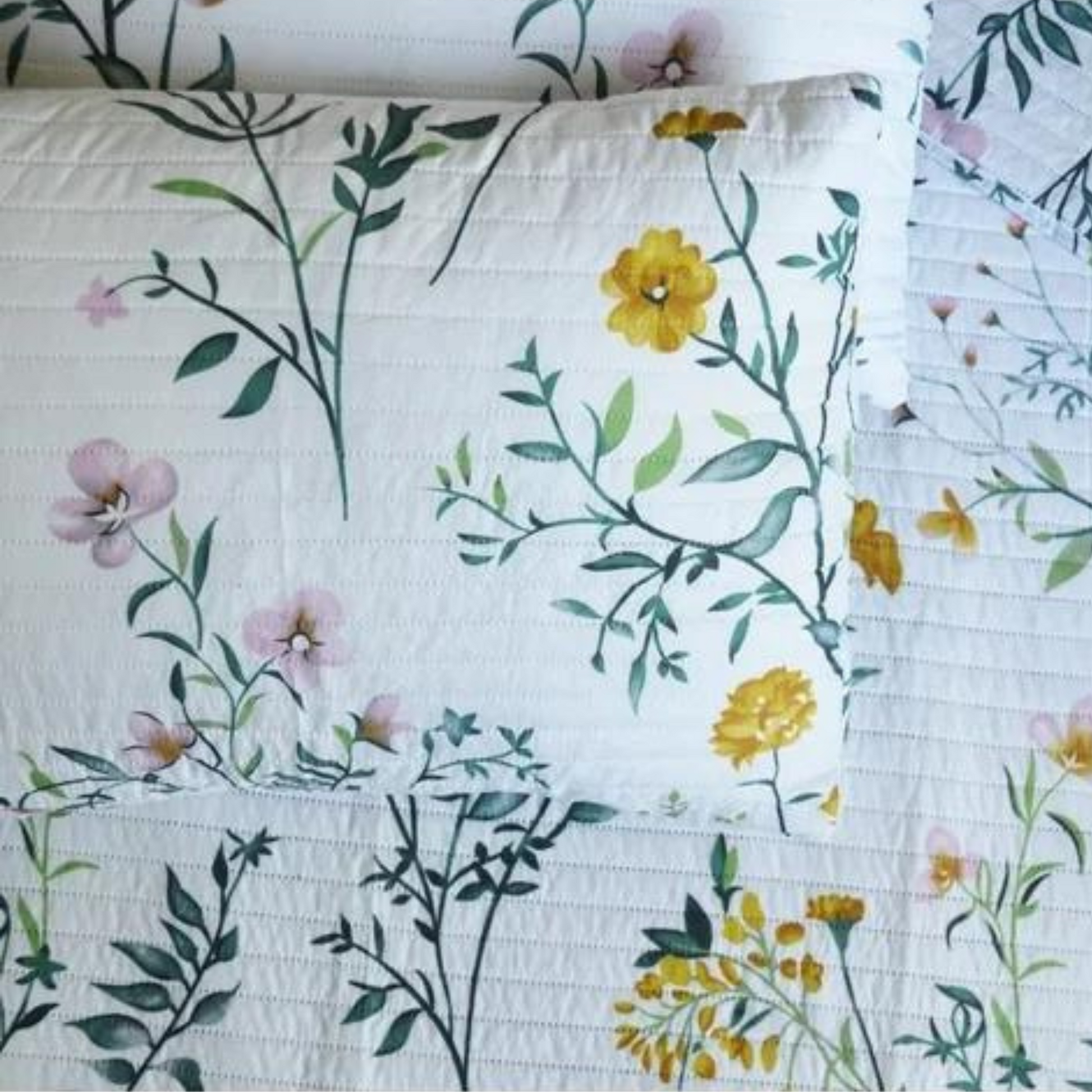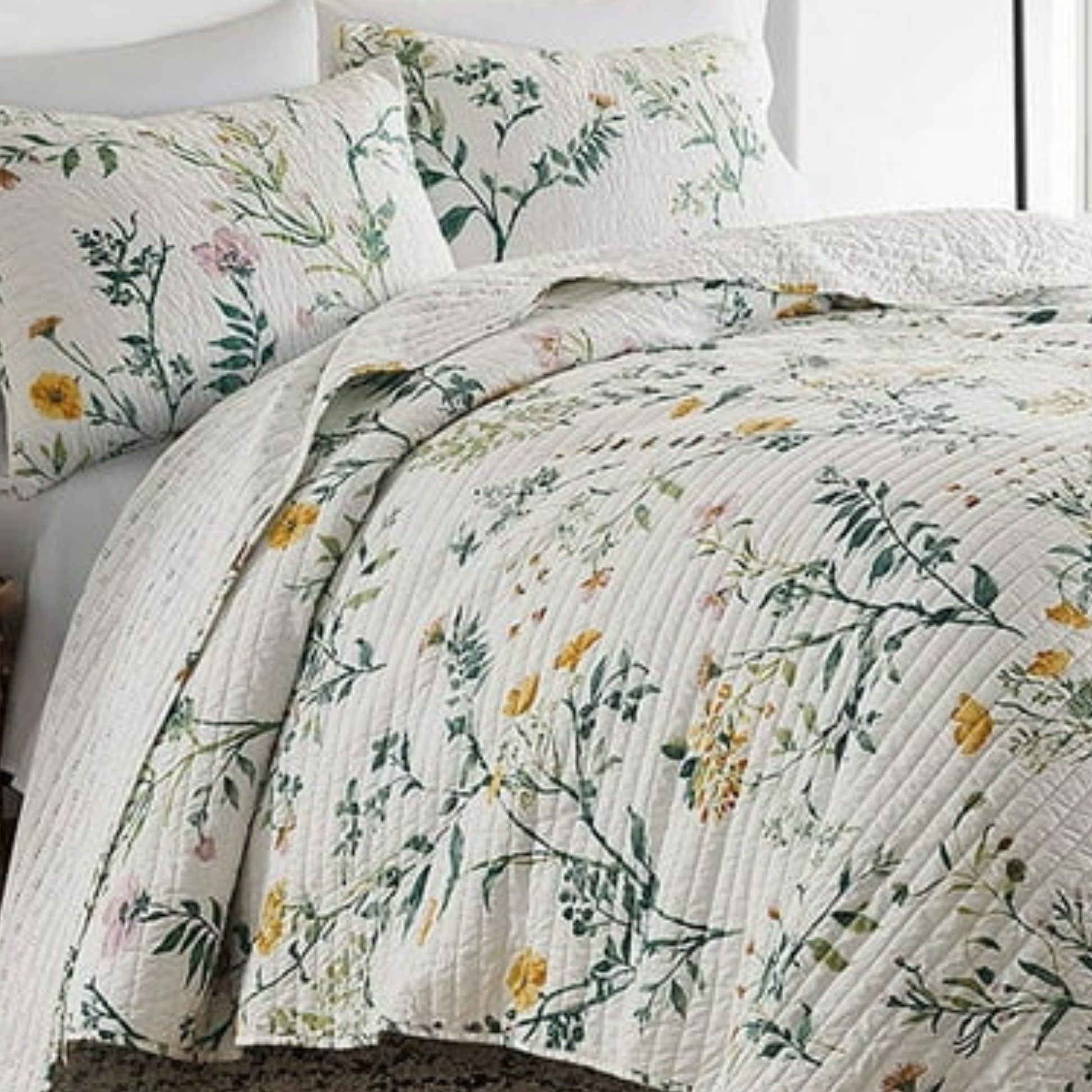 Donnez à votre chambre un look cottage avec cet ensemble de courtepointe de jardin floral ! Présentant des fleurs et des feuilles délicates imprimées sur un fond blanc. 💐