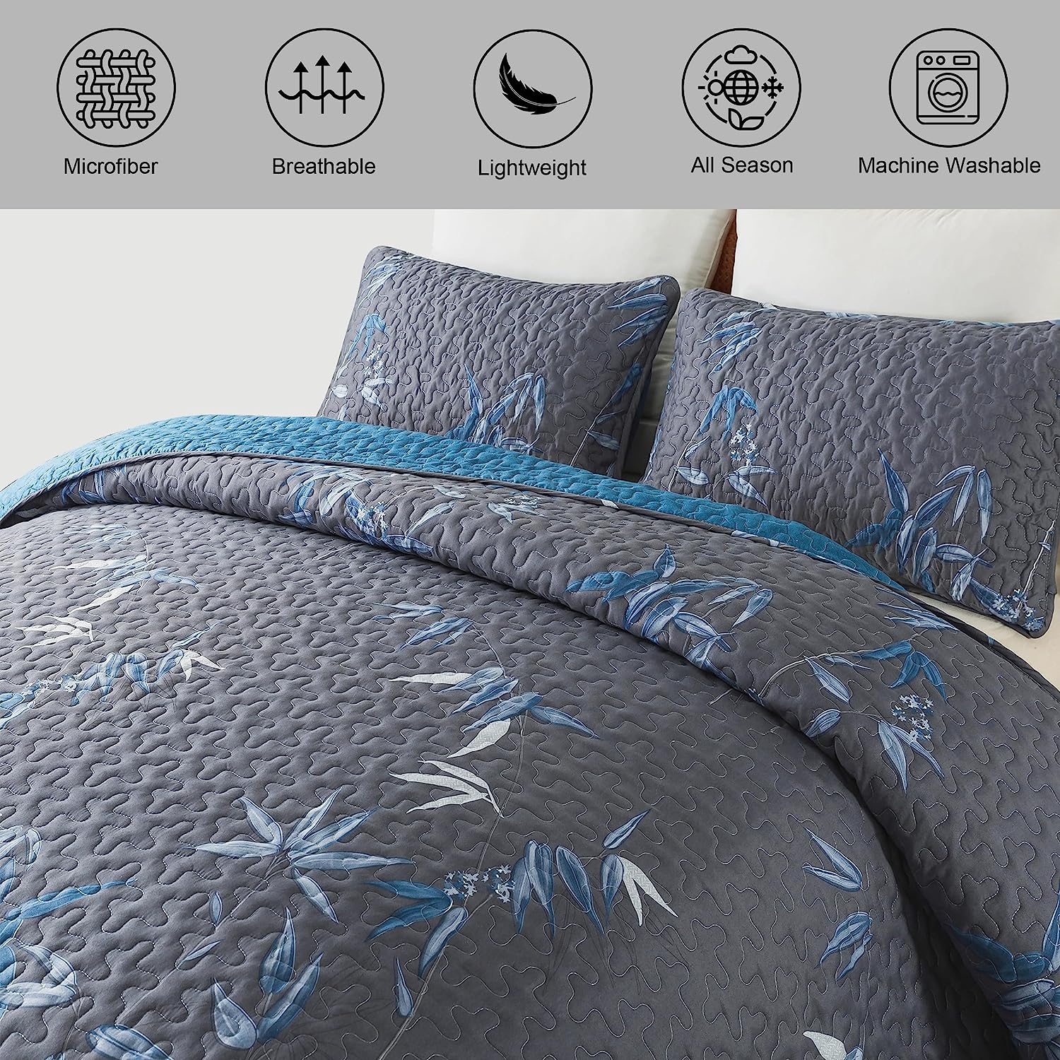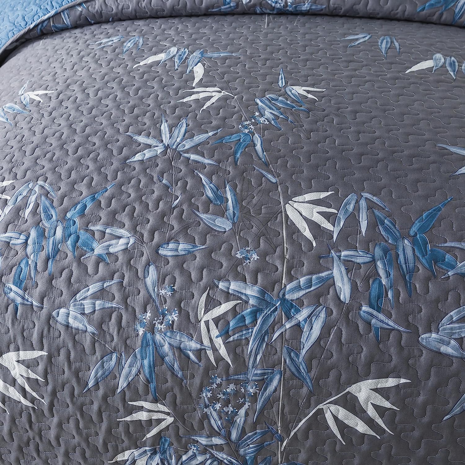 Botanical Navy Leaves Reversible 3 Piece Bedding Quilt Set