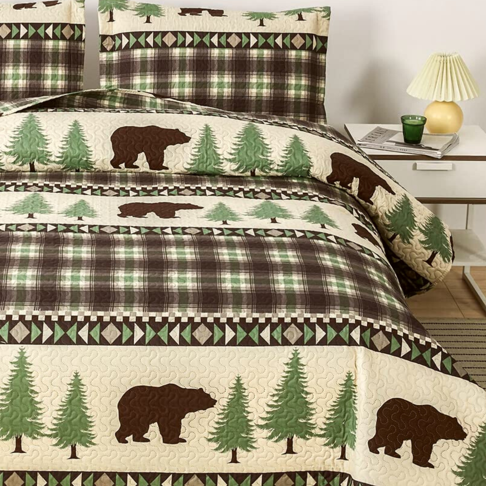Cabin Bear Brown & Green 3 Piece Bedspread Set