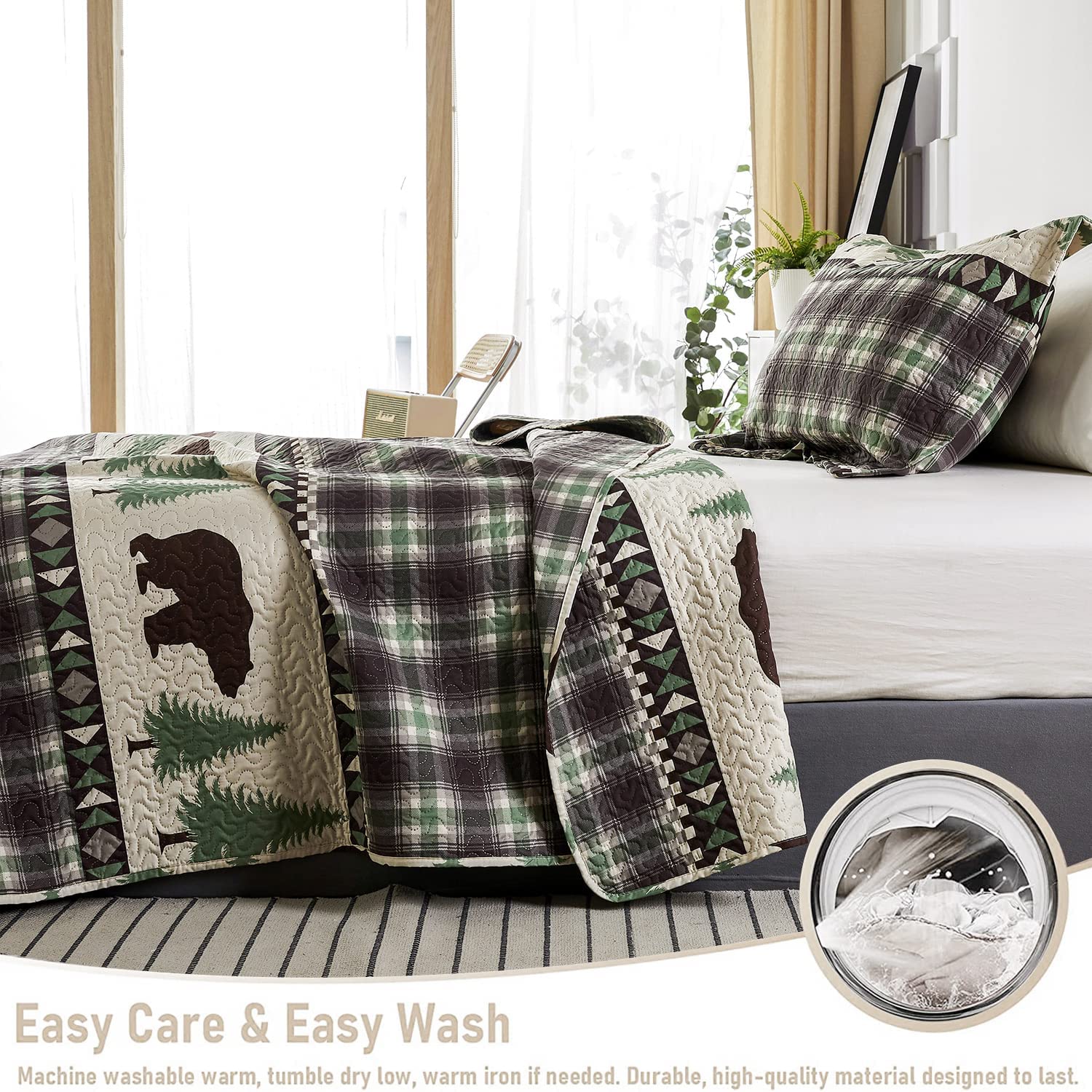 Lightweight and featuring a popular classic country pattern, our Cabin Bear Green & Brown Bedding Bedspread Set will look great in any cottage home!