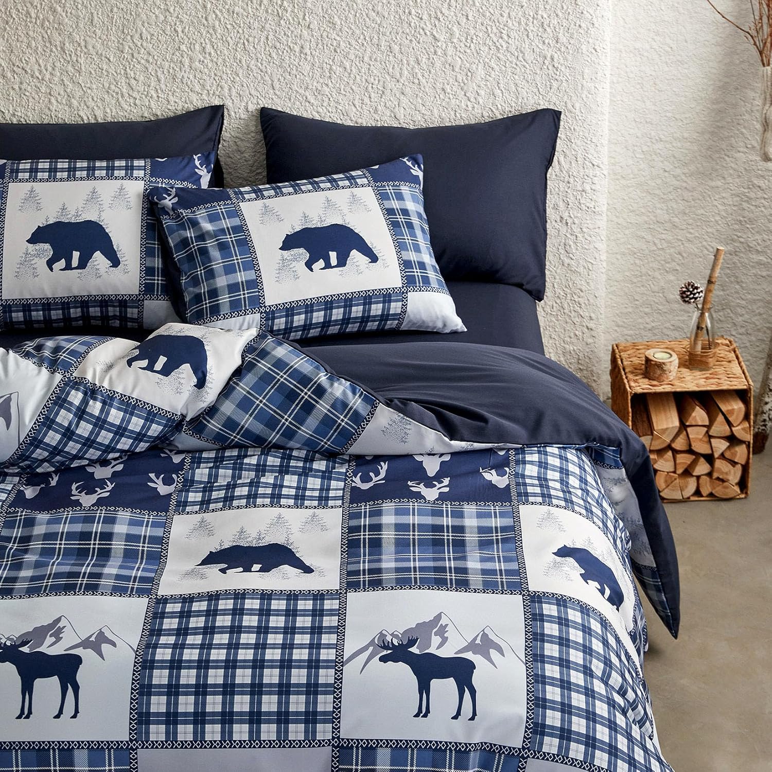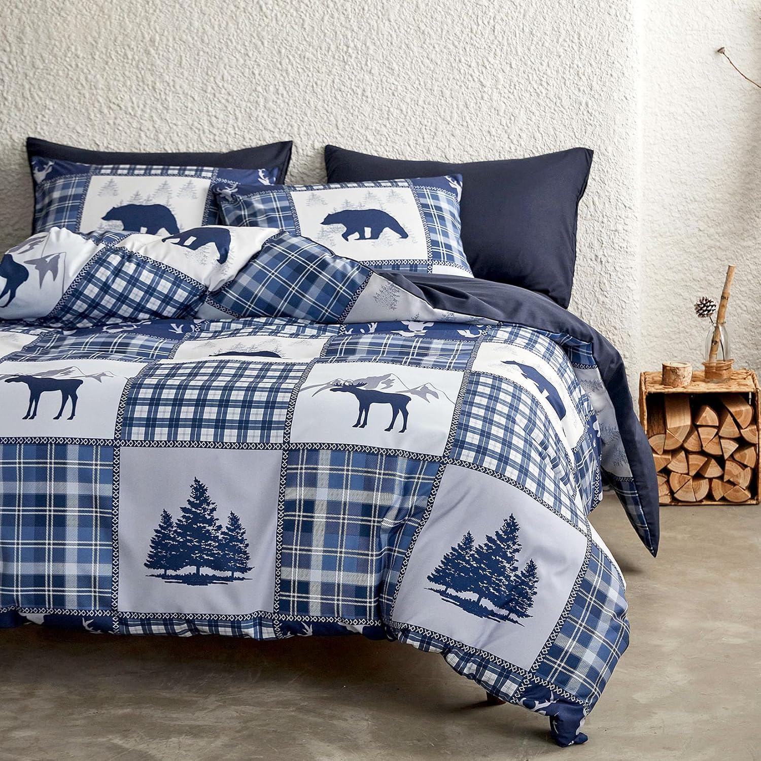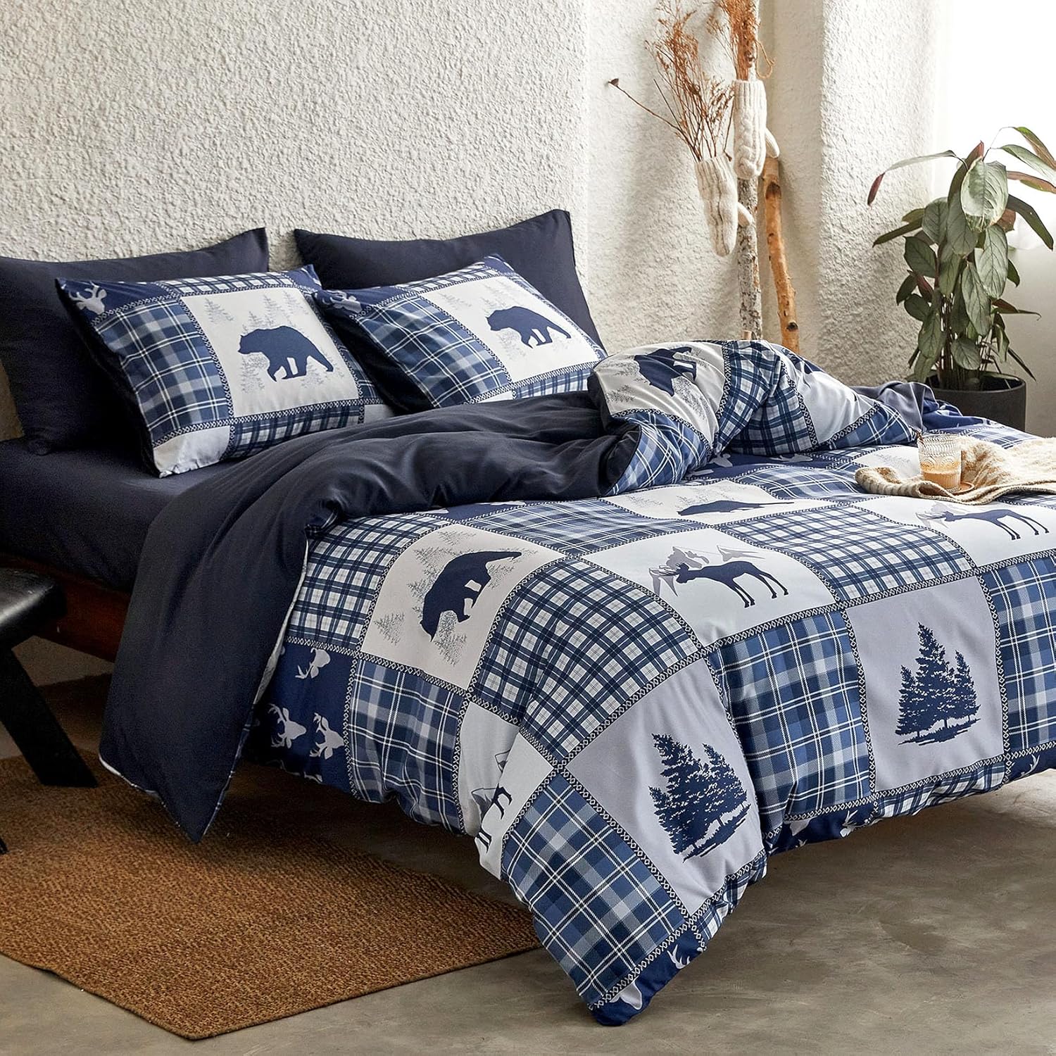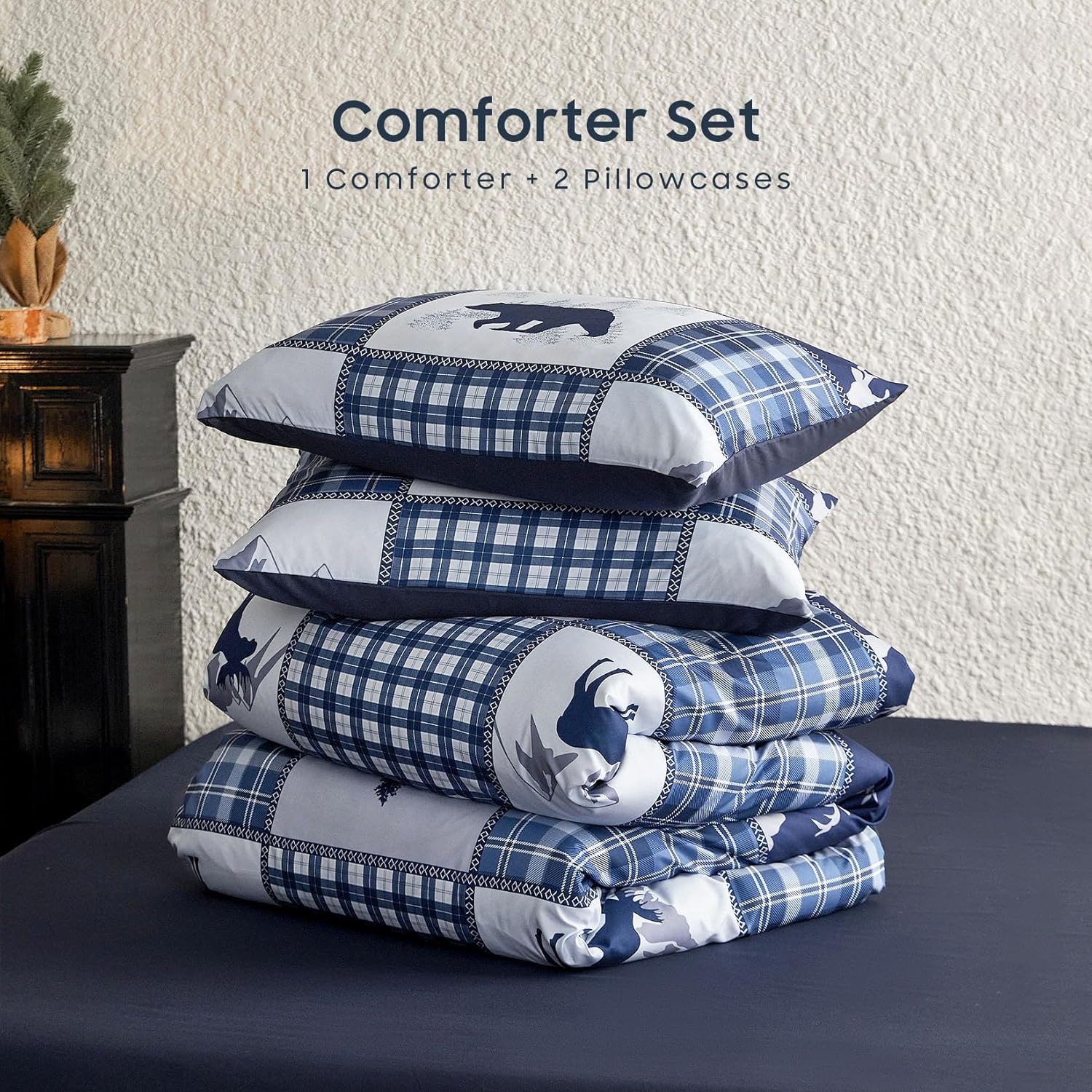 Close your eyes and think of an amazing night's sleep with one of the coziest comforters ever made. The navy blue patchwork design features a combination of plaid and woodland animal motifs with blue and white accents. š»