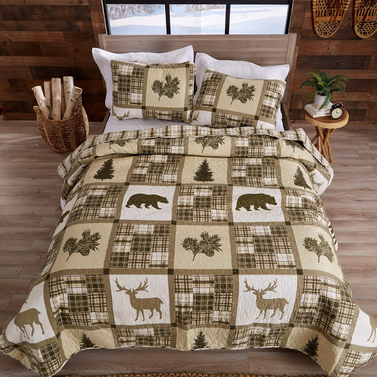 This rustic bedding is sure to instantly give your bedroom a lodge-style look. Patches of a variety of plaid patterns are combined with deer, and tree motifs to create this classically cozy quilt. Its unique details will easily blend with most country cottage decor and styles.