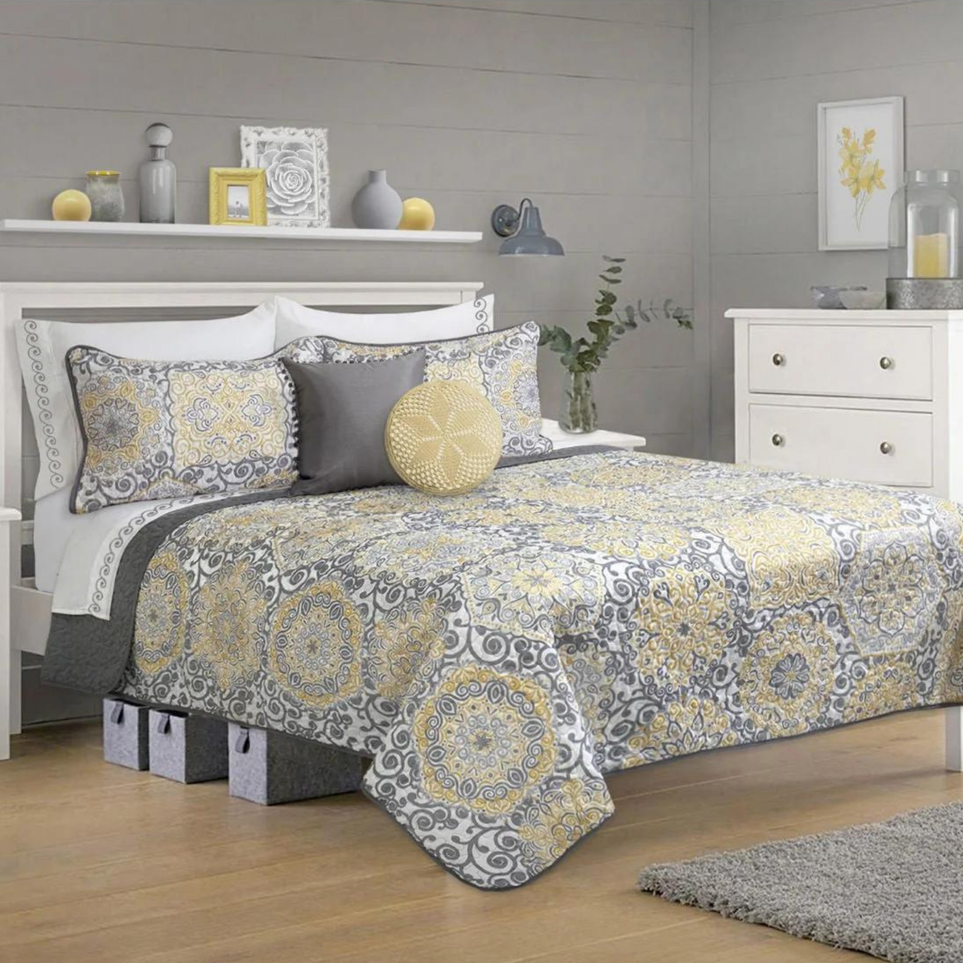Yellow & Grey Mandalas Reversible 3 Piece Bedding Quilt Set